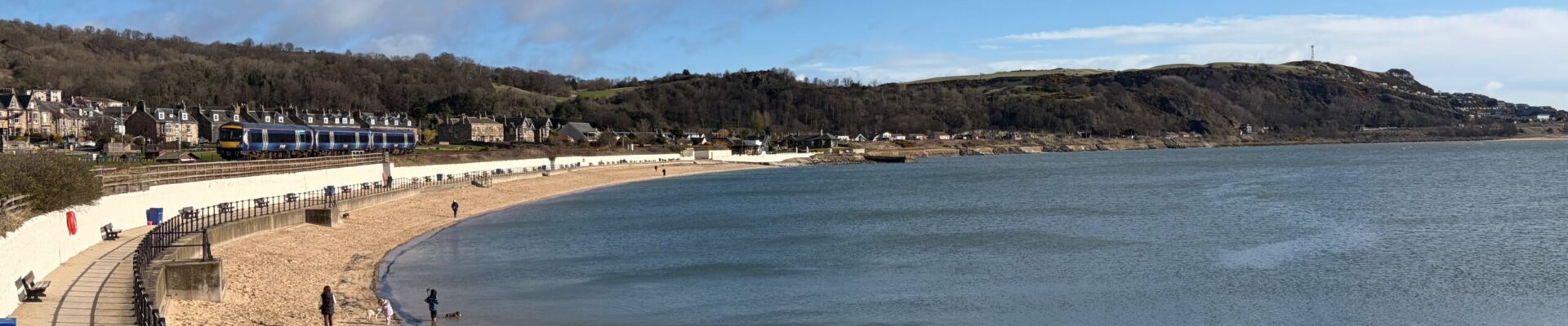This is my first visit to Fife and so all of these coastal communities are new to me. I’ve left the charming Aberdour and the next stop is the larger town of Burntisland, which seems much more populous and commercial. The beach lies to the east of the town, and is quite the draw, situated among a modern leisure centre and seaside park. These aren’t my favourite beaches but it’s reasonably quiet on this Saturday morning. A bloke on the beach is swearing at his dogs for spending too long in the sea. All a bit performative if you ask me. When the tide is out, this is one of Fife’s largest beaches, but this morning the tide is very much in, limiting the scope. I walk half the length of the visible beach and head through one of the access tunnels under the railway and onto a pleasant green area behind the bay. I capture the beach for the record, but I’m eager to get on my way.